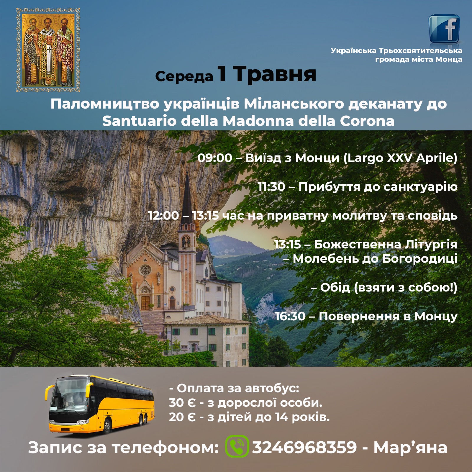 1 травня 2024 року відбудеться спільне паломництво українських церковних громад Ломбардії до санктуарію Мадонна делла Корона.