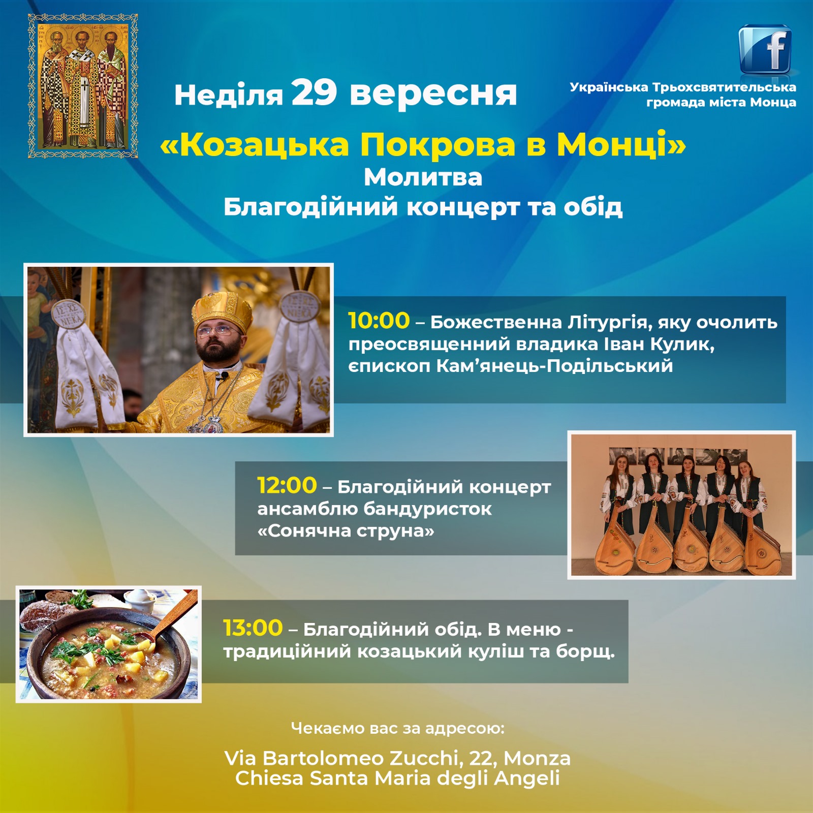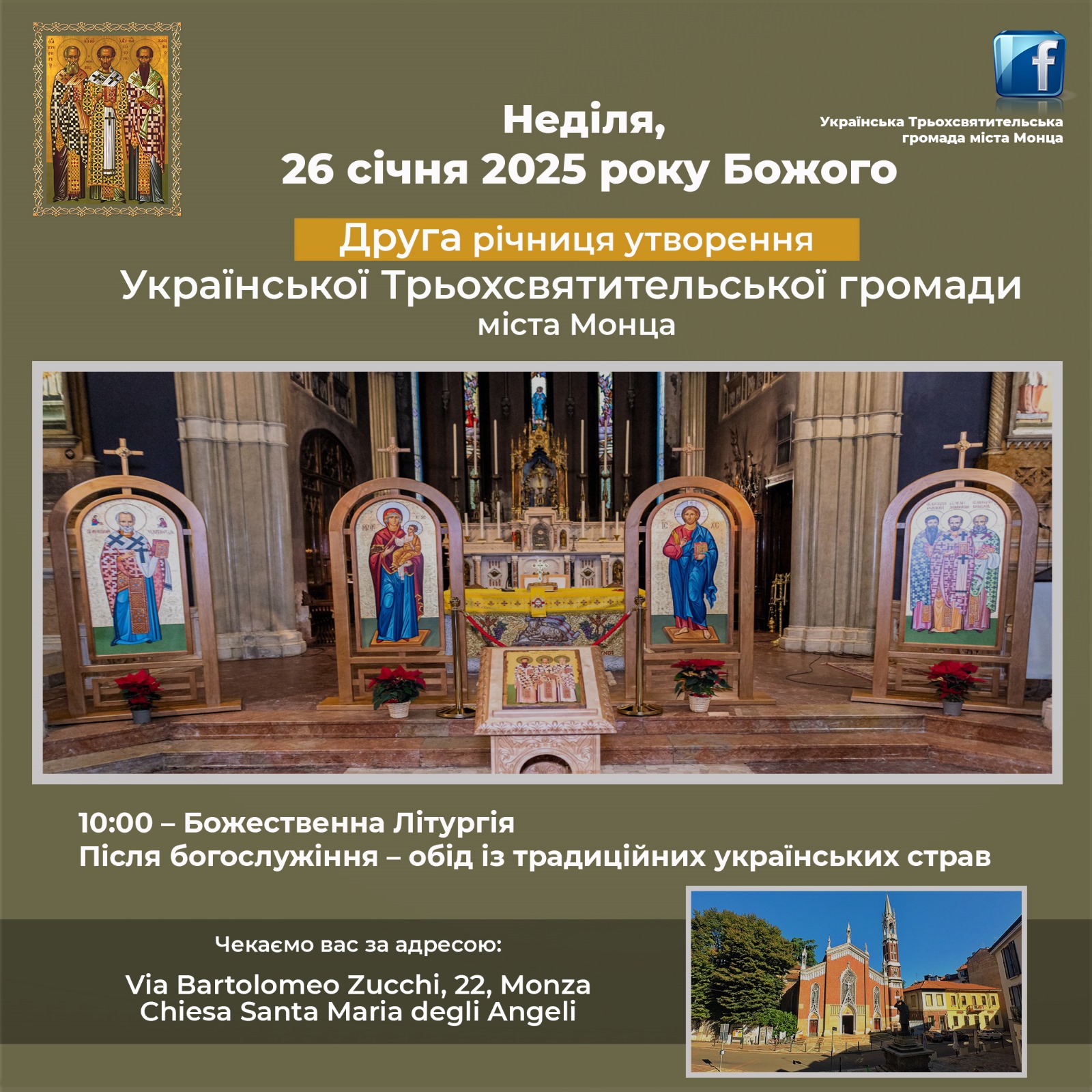 У неділю, 26 січня 2025 року о 10:00 в Місті Монца в храмі Марії Ангелької (Santa Maria degli Angeli), що знаходиться на via Bartolomeo Zucchi, 22 розпочнеться Божественна Літургія з нагоди святкування престольного празника Трьохсвятительської громади міста Монца.