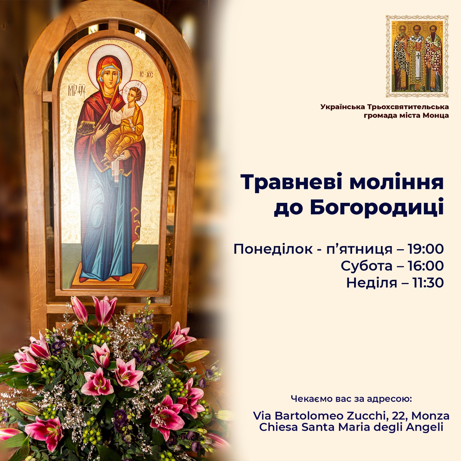 Щодня впродовж місяця травня в храмі, де збирається регулярно на молитву Трьохсвятительська громада міста Монца (Santa Maria degli Angeli), звершуватимуться паралітургійні богослужіння до Пресвятої Богородиці. Запрошуємо на спільну молитву!
