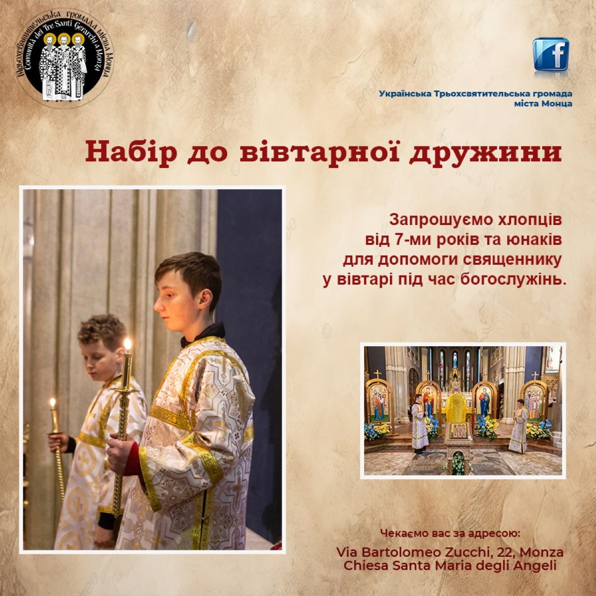 Запрошуємо хлопців від 7-ми років та юнаків для допомоги священнику у вівтарі під час богослужінь.